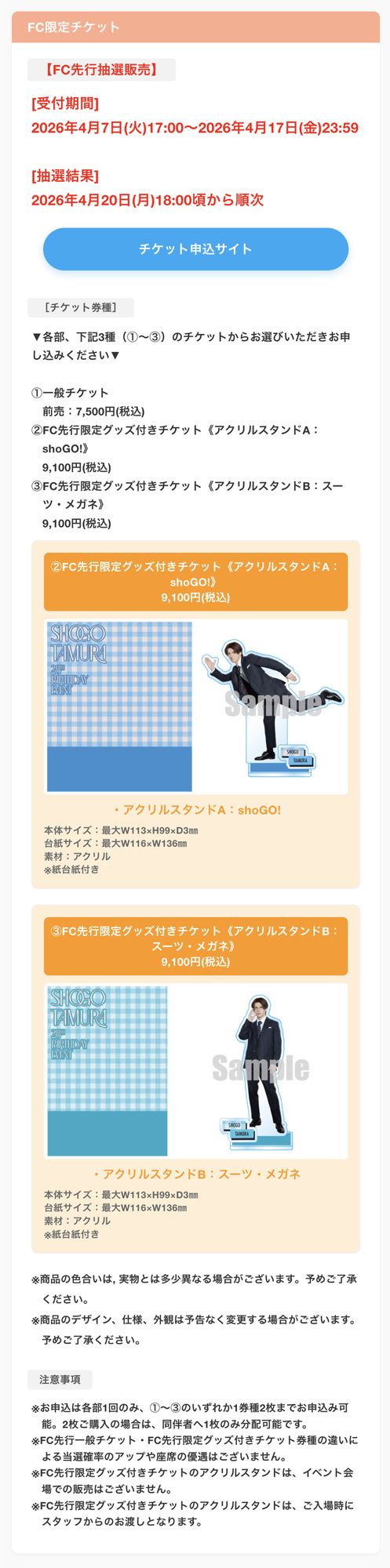 本日4月7日(火)17:00~よりFC限定グッズ付きチケット[(shoGO!)アクスタ・(スーツ・メガネ)アクスタ付き]